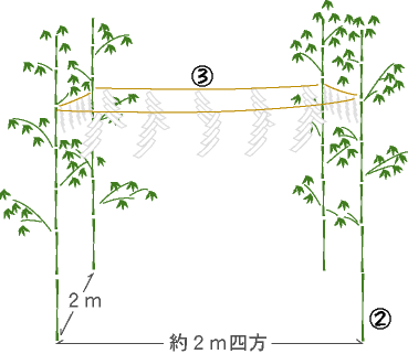 竹の上部約2メートル高さで右奥(艮(うしとら)の方=東北)の隅より時計回りに張りめぐらす。