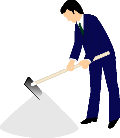 神職より忌鋤を受けた施工者は、神前に一礼、斎砂の前で左足を引いて、地を穿つ所 作を3度行い砂をくずす。終って神前に一礼して神職に返し自座に戻る。 |
